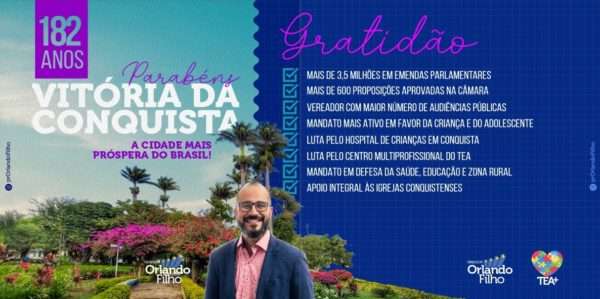 Nesta semana a cidade está estampada com vários outdoors onde o Vereador Orlando Filho agradece Vitória da Conquista pelos seus 182 anos, destacando segundo ele, como a Cidade mais próspera do Brasil.