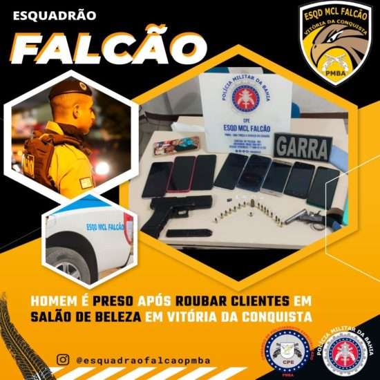 Um homem de 26 anos foi preso em flagrante após assaltar clientes em um Salão de Beleza em Vitória da Conquista. Após contato com as vítimas os policiais encontraram o indivíduo com as mesmas características e o veículo utilizado no crime. Em sua residência os militares encontraram 8 celulares, sendo três das vítimas do Salão, um simulacro de arma de fogo e uma pistola tipo Garrucha. Além de munições.