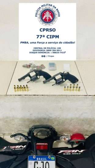 Por volta das 12h desta terça-feira (27), durante patrulhamento tático no bairro Centro, uma guarnição do PETO da 77ª CIPM foi acionada por um transeunte, informando que teria acabado de ver um indivíduo armado na Av. Vivaldo Mendes. O PETO realizou rondas no local, e na Av. Otávio Santos, avistou um indivíduo com as mesmas características passadas. O indivíduo ao avistar a guarnição, adentrou rapidamente em uma clínica médica. Foi contido e em sua cintura encontrada uma arma de fogo e em seus bolsos uma quantidade de substância aparentando ser maconha. Após a identificação, verificou-se que o indivíduo era suspeito de diversos roubos de motos e celulares na cidade de Vitória da Conquista. Ele informou que teria roubado uma moto no dia anterior e deixado com um colega no bairro Campinhos, condomínio Campo Verde. Ao se aproximar do local, um outro indivíduo evadiu pilotando uma motocicleta azul. Na residência, tinha uma mulher que disse ser esposa do indivíduo que fugiu. Ela autorizou a busca no imóvel, e nl quarto do casal, foi encontrada uma arma de fogo, munições, embalagens e balança. Diante das circunstâncias, o indivíduo e todo material foram apresentados no Plantão. No DISEP, algumas testemunhas reconheceram o conduzido como autor de roubos cometidos ontem no bairro Morada dos Pássaros.
