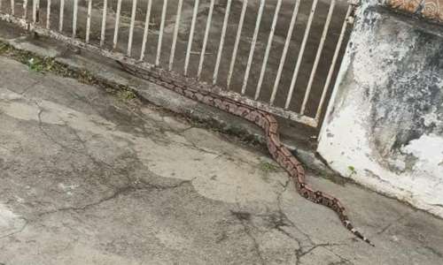 Uma cobra de aproximadamente dois metros invadiu o quintal de uma casa e quase invadiu um dos cômodos da residência da solicitante, que entrou em contato com o plantão de polícia.