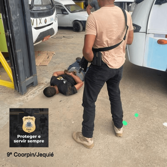 Crime, contudo o autor também atingiu J.O.C.S.F., o qual era o instrutor da autoescola. Foi apurado ainda que, durante a ação criminosa, a vítima D.M. estava armado, pois estava jurado de morte, e chegou a reagir e atingiu o autor de raspão na cabeça, contudo o autor conseguiu atingir seu intento e acabou assassinando D.M. Na noite do mesmo dia, a Polícia Civil recebeu informações que um indivíduo teria dado entrada no Hospital Prado Valadres com um ferimento na cabeça provocado por arma de fogo, razão pela qual se deslocou até o local, onde identificou o homem como sendo R. V. S. C. Após meticuloso trabalho de investigação, através da oitiva de testemunhas e realização de perícia em um capacete abandonado pelo autor no local dos crimes, capacete este que estava com um projétil alojado e com marcas de sangue, 9 setor de investigação da Delegacia de Brejões conseguiu demonstrar que R. V. S. C. teria saído do entroncamento de Jaguaquara e foi até o Km100, onde matou D.M. e feriu o instrutor J.O., razão pela qual a Autoridade Policial representou pela prisão preventiva do autor, a qual foi deferida pelo Poder Judiciário. Após um trabalho de monitoramento e campana foi possível constatar que R. V. S. C. estaria trabalhando em uma oficina no entroncamento de Jaguaquara, motivo pelo qual, na data de hoje (08/03/2023),por volta das 15:30h, as equipes da DT/Jaguaquara e do Setor de Investigação da Coordenadoria Regional de Jequié diligenciaram até o local, onde localizaram e deram cumprimento ao mandado de prisão em desfavor de R. V. A. C.