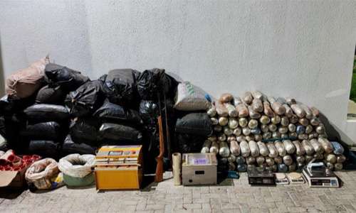 Além dos 634 kg de maconha, os policiais apreenderam uma prensa manual, duas seladoras a vácuo, embalagens plásticas e duas espingardas.