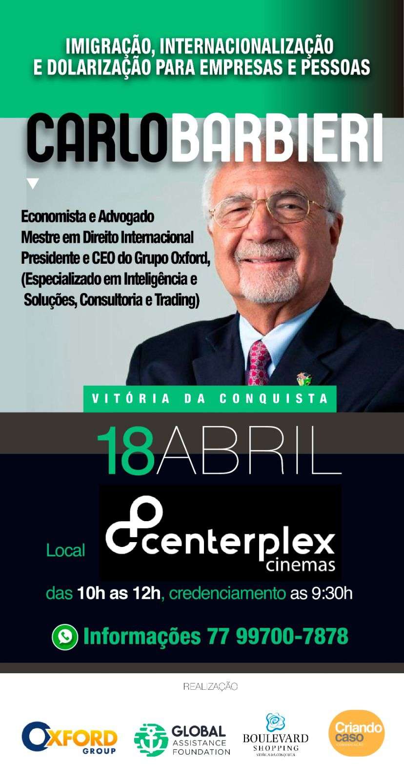 No próximo dia 18 de abril, Vitória da Conquista vai receber uma palestra com Carlo Barbieri: Presidente e CEO do Grupo Oxford (Especializado em Inteligência e Soluções,composto por corporações internacionais de consultoria e trading. A maior entidade empresarial de consultoria brasileira nos EUA. Formado em Economia pela Universidade Jesuíta São Luiz e Direito pela Universidade Presbiteriana Mackenzie em São Paulo. Mestre em Direito Internacional pela Universidade Ambra, nos Estados Unidos.