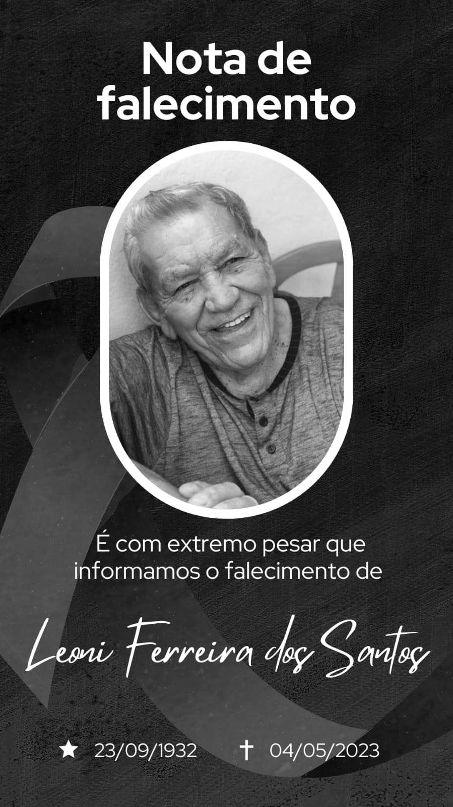 É com pesar que informamos o falecimento do Senhor Leoni Ferreira dos Santos, morador do distrito de Bate Pé, que ocorreu no dia 04/05/2023 aos 90 anos. Sua partida deixa um vazio em nossos corações e em toda a comunidade que o conhecia e respeitava. Neste momento difícil, desejamos conforto e força para seus familiares e amigos próximos. O Senhor Leoni será sempre lembrado por ser um grande exemplo de vida. Que descanse em paz.