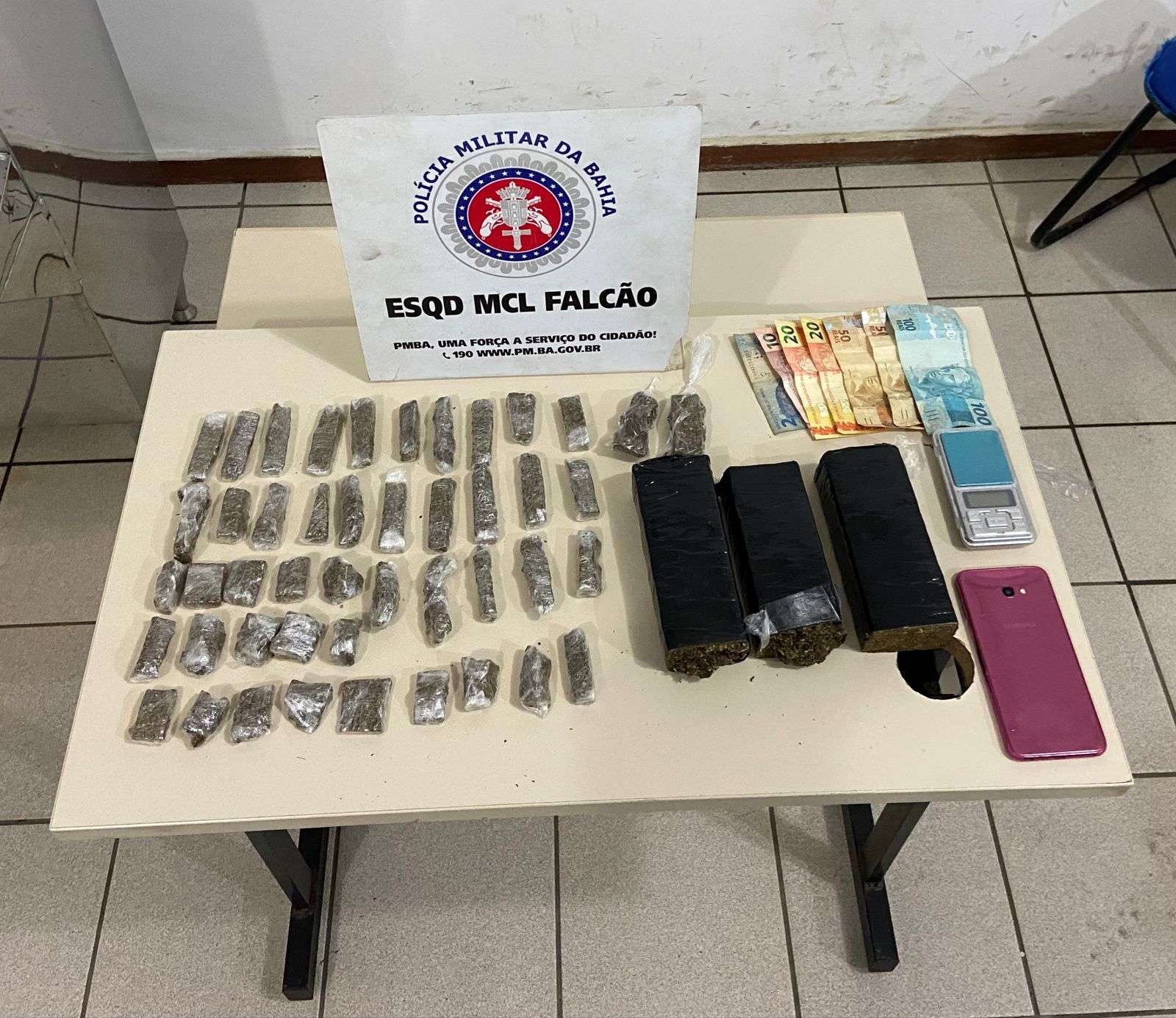 O primeiro indivíduo, que estava em uma bicicleta de cor preta, foi encontrado com 03 (três) porções de maconha e um celular durante as buscas realizadas em seu bolso. O segundo indivíduo invadiu a residência de um morador e tentou escapar pelo telhado, danificando várias telhas no processo. No entanto, foi capturado com uma sacola contendo tabletes de maconha, diversas porções da mesma substância prontas para consumo e uma balança de precisão.