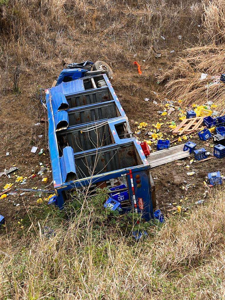 De acordo com informações da Polícia Rodoviária Estadual, o caminhão, que transportava bebidas, ‘perdeu o freio’ e desceu a ribanceira.