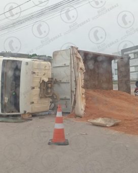 Na tarde desta quinta-feira (12), uma caçamba tombou em frente à entrada do bairro Nossa Senhora Aparecida, em Vitória da Conquista.