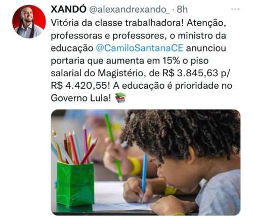 Por meio de suas redes sociais, o vereador de Vitória da Conquista Xandó (PT) celebrou a notícia “Vitória da classe trabalhadora! A educação é prioridade no governo Lula!”, escreveu.