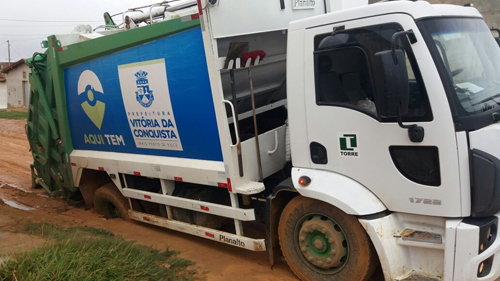 Há 8 anosConquista: Caminhão de lixo da Prefeitura 'afunda' em buracão no Conveima
