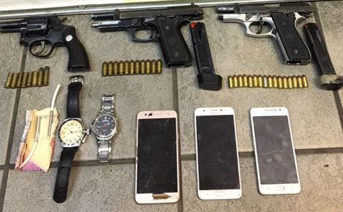 Duas pistolas – uma calibre .40 e outra .380 -, um revólver calibre trinta e oito, dois cordões detonadores com...