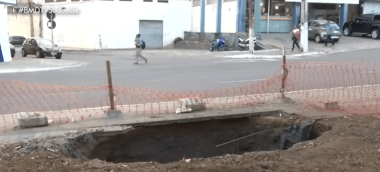 Comerciantes e pedestres fazem um alerta no centro de Vitória da Conquista. Na Rua Lisboa o asfalto está cedendo...
