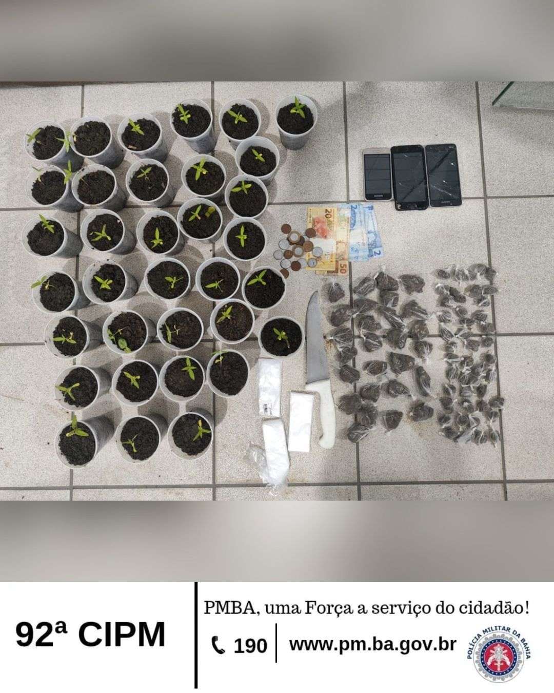 Na noite deste sábado (25), Policiais Militares da 92ª CIPM apreenderam entorpecentes e mudas de plantação de Cannabis sativa ,...