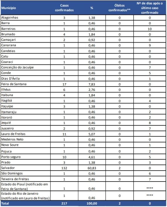 A Bahia registra 217 casos confirmados do novo coronavírus (Covid-19), o que representa 3,7% do total de casos notificados. Até...
